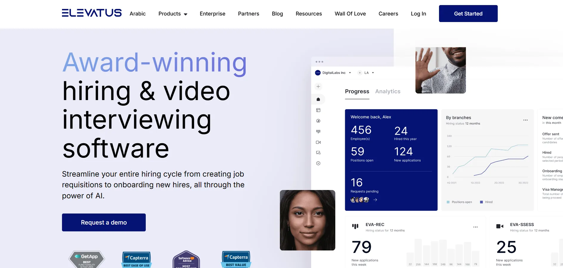 - AI-powered video interviews with structured evaluation tools