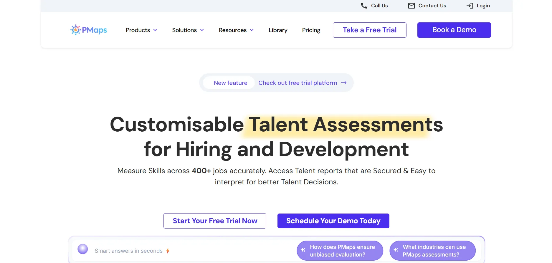 PMaps Talent Assessment Platform is an advanced AI-powered hiring solution that delivers deep insights into candidate suitability through smart evaluations. With an assessment accuracy exceeding 80%, it ensures precise talent matching, leading to higher retention rates and improved workforce performance.