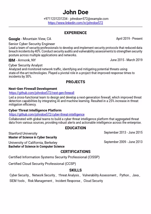 Create a winning impression with our Harvard University Approved template for Cyber Security Engineer.