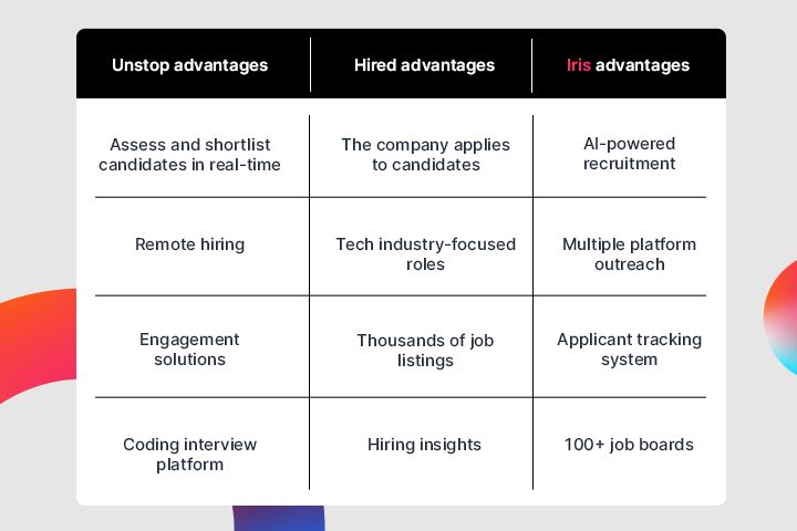 A Comprehensive Feature Comparison of Hired, Unstop and Iris by Qureos
