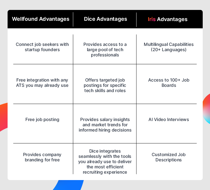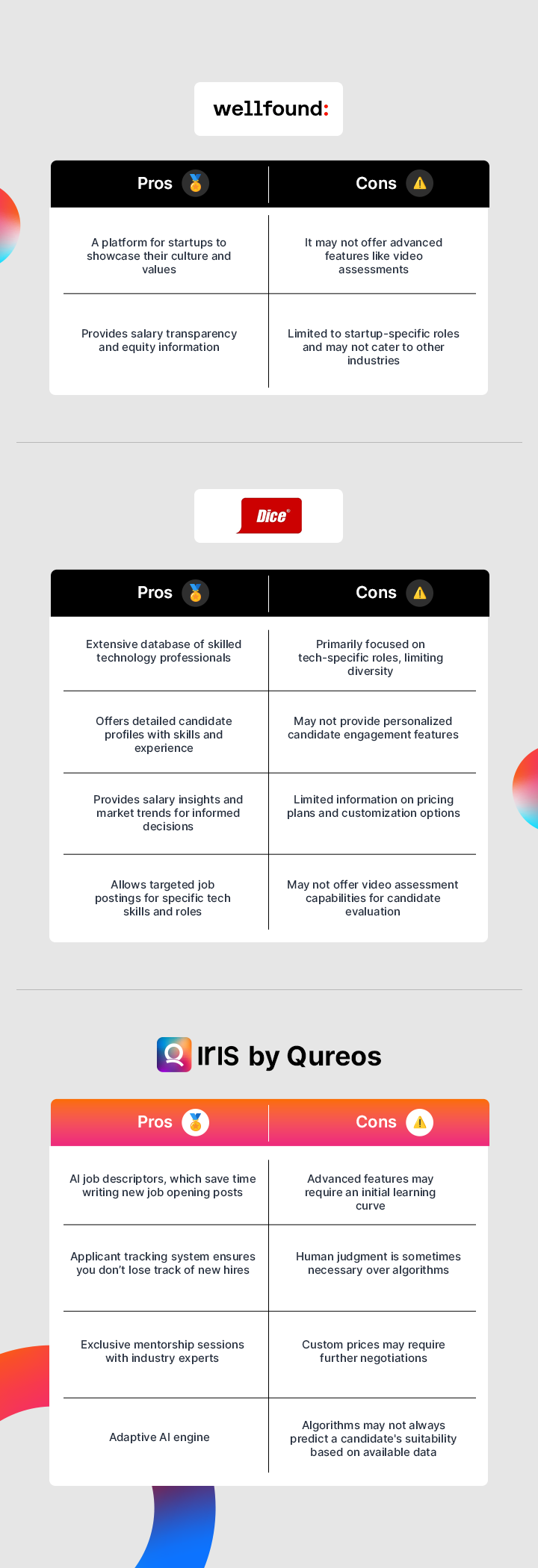 Pros and Cons of Choosing Wellfound, Dice and Iris by Qureos