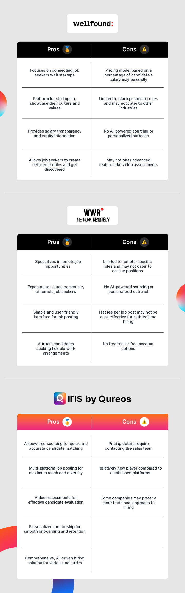 Pros and Cons of Choosing Wellfound, We Work Remotely and Iris by Qureos